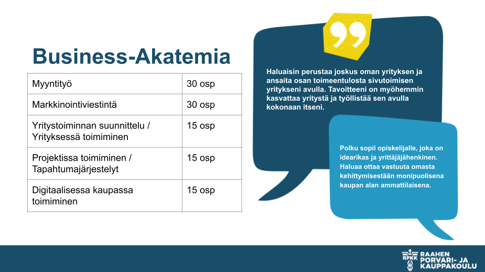 Liiketoiminnan perustutkinnon suorittaminen reilussa vuodessa. Vuosi+ on suunnattu ylioppilaille tai lukion päättäneille, välivuotta pitäville. Pääsyvaatimuksena vähintään 90 opintopistettä lukion opintoja. Koulutuksessa on kaksi polkua: Vuosi töissä tai Tradenomispurtti. Lue lisää Vuosi+ koulutuksesta.