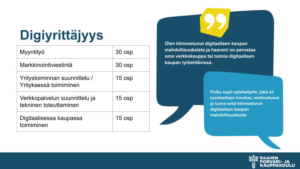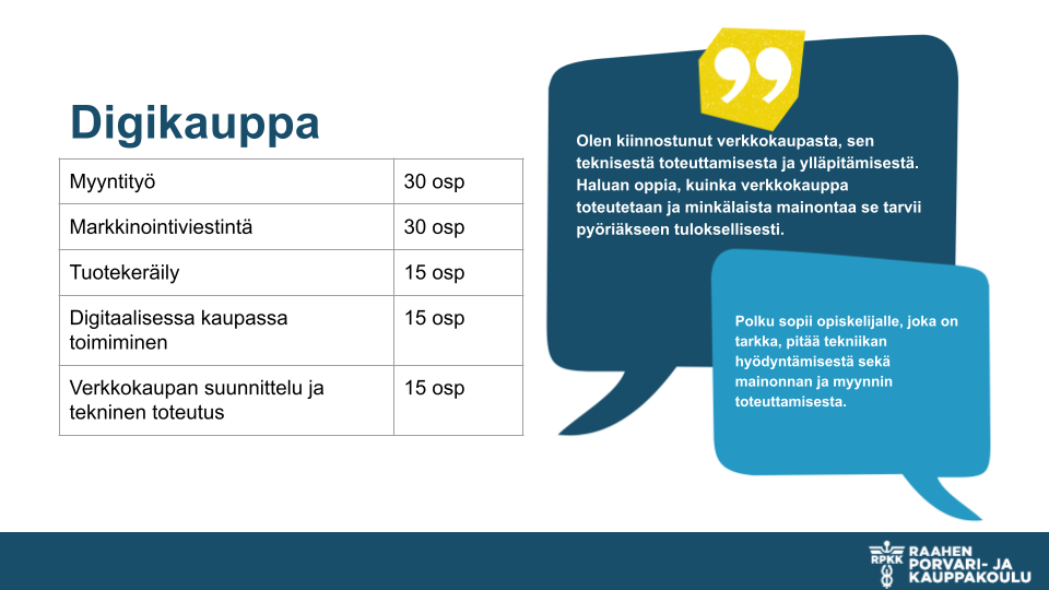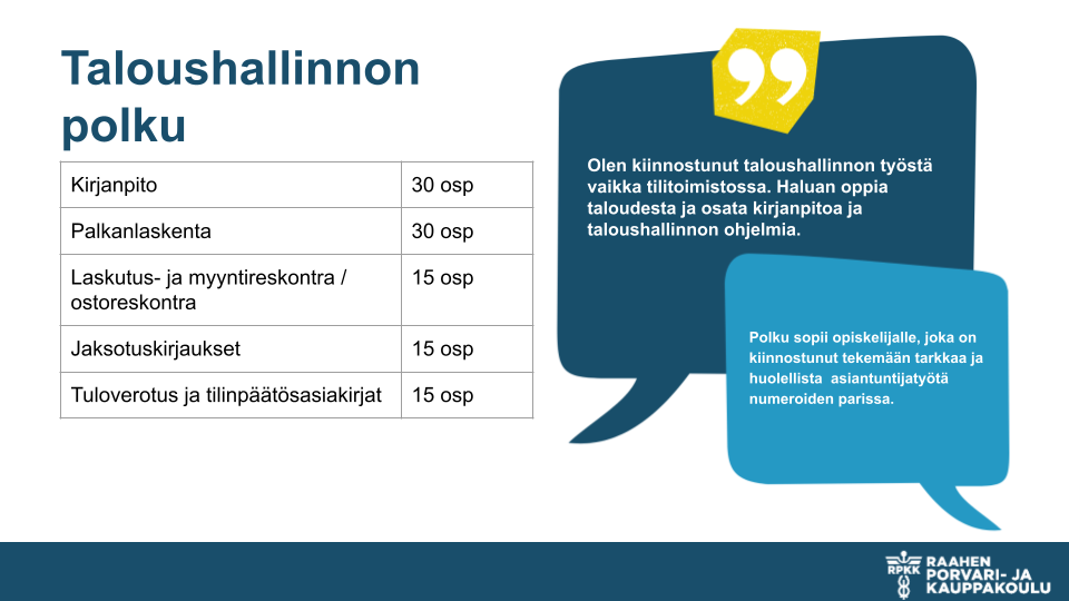 Liiketoiminnan perustutkinnon, merkonomi, voi suorittaa peruskoulupohjaisena. Pakollisten ammatillisten tutkinnon osien Asiakaspalvelun ja Liiketoimintatehtävissä toimimisen lisäksi pääset valitsemaan loput tutkinnon osat eri polkuvaihtoehdoista. Alla voit tutustua näihin polkuvaihtoehtoihin. Viralliset tutkinnon perusteet löydät ePerusteet -palvelusta.