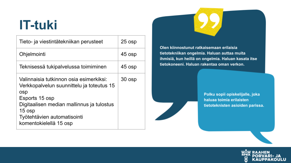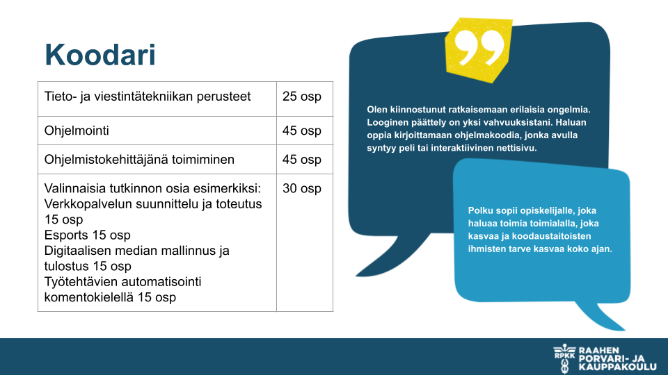Tieto- ja viestintätekniikan perustutkinnon, ohjelmistokehittäjä, voi suorittaa peruskoulupohjaisena. Pakollisten ammatillisten tutkinnon osien lisäksi pääset valitsemaan loput tutkinnon osat eri polkuvaihtoehdoista. Alla voit tutustua näihin polkuvaihtoehtoihin. Meillä voit suuntautua opinnoissasi pääasiallisesti peli- tai webohjelmointiin. Lisäksi voit ottaa valinnaisia tutkinnon osia siten, että voit opiskella opintojaksoja myös IT-tukihenkilön suuntautumisvaihtoehdoista. Viralliset tutkinnon perusteet löydät ePerusteet -palvelusta.